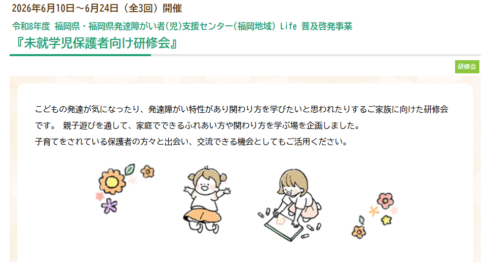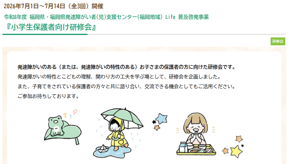 そのような保護者の方に向けて、福岡県発達障がい者支援センターLife様より研修会のご案内が届いています。今回の研修では、お子さんへの具体的な支援方法や、家庭でできる工夫など、日常生活にすぐ活かせる内容が紹介される予定です。