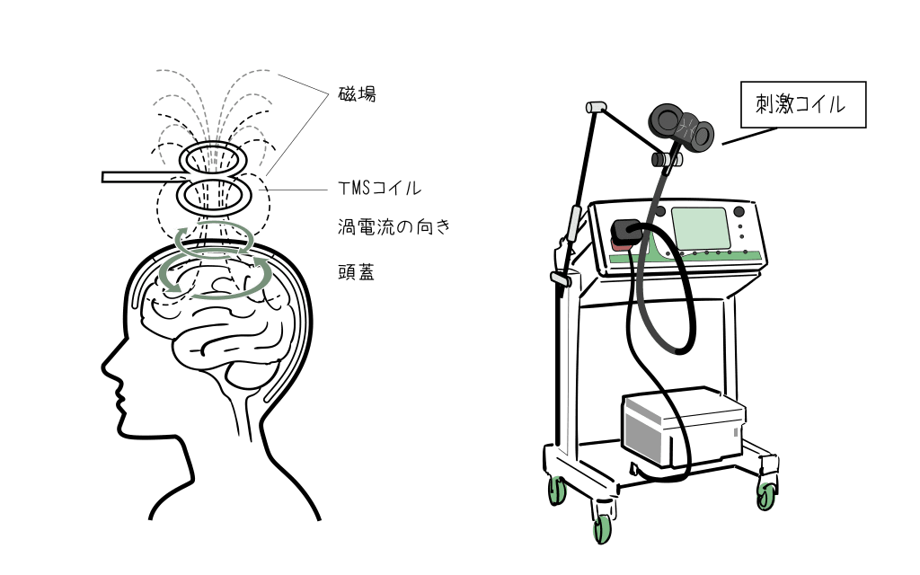 専用の機器から発生する磁気パルスを頭部の特定の部位(多くの場合は前頭前野)にあてることで、脳の活動バランスを改善し、気分の落ち込みや意欲の低下を軽減します。